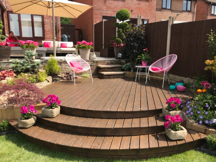 Description: In Biddulph, Staffordshire, our clients faced a dilemma: a sloping garden with a toddler, making the existing pond a safety concern. We organised for a complete garden transformation, prioritising safety and aesthetics. The former pond area was converted into a rockery, adorned with a variety of evergreen plants. To preserve the soothing ambiance of running water, a waterfall feature was integrated, its sump concealed beneath pebbles. We leveled the lawn with inverted sleepers, encircling it with a protective box hedge. A circular deck emerged as a serene seating area, adjacent to a vibrant herbaceous border. Below, slate chips and thoughtfully placed plants ensured low-maintenance. At the top of the patio, sleek grey Indian stone welcomed plush loungers, harmonising with the contemporary theme of the property. This reimagined oasis brings together safety, style, and serenity, epitomising our commitment to transformative garden landscaping.