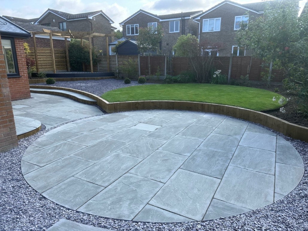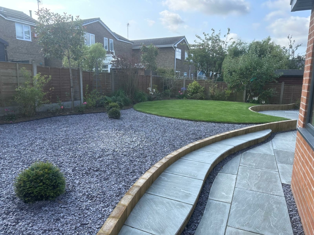 The new design replaced the expansive lawn with a more manageable green area, framed by planting borders along the fence line to soften the boundaries. At the garden’s heart, a gravel terrace now leads the eye toward a raised deck in the corner, creating a natural flow between zones for relaxation and socialising. A curved retaining wall with integrated steps adds both structure and movement to the space, while a central circular seating area forms the focal point for gatherings. Improved access around the house and new steps to the rear doors complete the transformation, ensuring the garden feels open, inviting, and practical.