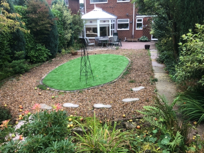 Description: Seeking a partial garden refresh, the client in Biddulph, Staffordshire, opted for a solution that retained the existing structure while improving aesthetics. We proposed using sleepers to define borders and integrate steps, along with replacing old paving with new Indian stone for a refreshed look. To address the client’s dissatisfaction with the existing gravel area, we opted for a bound gravel (hoggin), offering a distinct material choice that wasn’t traditional paving nor loose gravel. This approach maintained the garden’s character while providing a refreshed appearance.